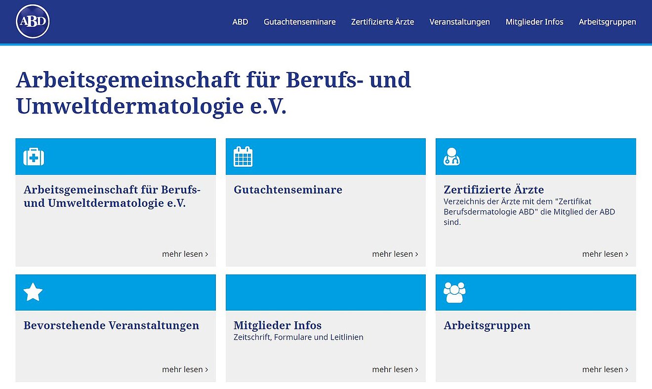 Die Arbeitsgemeinschaft für Berufs- und Umweltdermatologie e.V. (ABD) ist in der Deutschen Dermatologischen Gesellschaft (DDG) zuständig für die beruflichen und umweltbedingten Hautkrankheiten. Zu den Zielen und Aufgaben der ABD gehören die Erarbeitung, Verbesserung und Intensivierung der medizinisch-wissenschaftlichen Methoden zur Vorbeugung, Früherkennung, Rehabilitation und Begutachtung von beruflichen und umweltbedingten Hautkrankheiten.