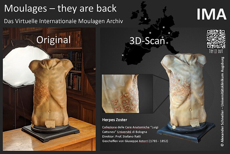 Aufgabe des Virtuellen Internationalen Moulagen Archivs ist es, diesen Digitalisierungsprozess anzustoßen und zu begleiten. Es stehen bereits über 500 3D-Rekonstruktionen aus den Beständen von Frankfurt, Paris, Zürich und Bologna zur Verfügung. Interessierte Sammlungen können sich bei Interesse an einer Teilnahme gerne an alexanderfelix.schneller(at)uk-augsburg.de wenden.
