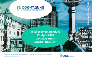 Mitglieder der Deutschen Dermatologischen Gesellschaft (DDG) sind herzlich eingeladen, an der diesjährigen Mitgliederversammlung teilzunehmen, die auf der 52. Tagung der DDG vom 24.-29. April 2023 in Präsenz in Berlin stattfinden wird. Die Einladung und alle wichtigen Informationen zur satzungsgemäßen Mitgliederversammlung sind im Mitgliederbreich abrufbar. Wir freuen uns auf Ihre Teilnahme!