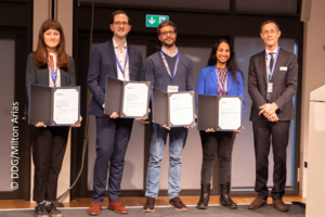 Besondere Auszeichnungen brauchen einen festlichen Rahmen. Und der ist bei einer Tagung allemal gegeben. So überreichte DDG-Generalsekretär Prof. Mark Berneburg auf der KoPra die Urkunden des Clinician Scientist Program der Deutschen Stiftung für Dermatologie an die vier neuen Stipendiatinnen und Stipendiaten: PD Dr. Cindy Franklin und Dr. Ricardo Niklas Werner (Advanced Clinician Scientists), Dr. Glenn Geidel und Dr. Zsuzsanna Kurgyis (Clinician Scientists).