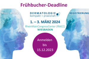 Der Frühbucherrabatt lohnt sich! Statt regulär 270,00 Euro zahlen Sie als DDG- oder BVDD-Mitglied für das Ticket für die DERMATOLOGIE kompakt + praxisnah (1. bis 3. März 2024 in Wiesbaden) bis zum 15. Dezember 2023 nur 200,00 Euro. Drei Tage aktuelles Wissen aus allen Bereichen der Dermatologie aufnehmen – kompakt aufbereitet und zugeschnitten auf die tägliche Praxis.