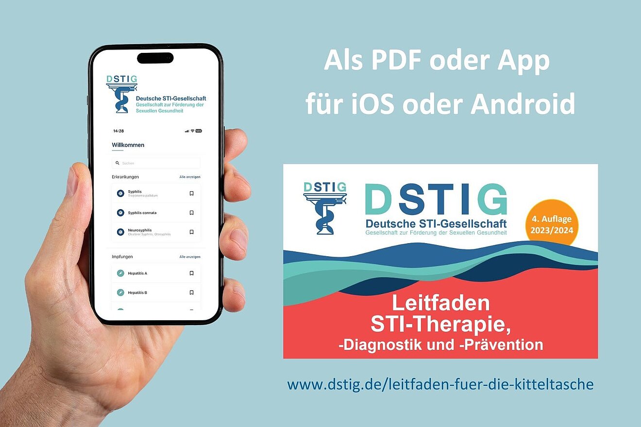 Den STI-Leitfaden gibt es als App für iOS oder Android. Dort finden Sie Empfehlungen zur STI-Beratung und zur klinischen Untersuchung. Zu ausgewählten STI wie Syphilis, Gonorrhoe, Chlamydien, HIV u.a. werden detaillierte Angaben zu den diagnostischen Verfahren und zur Therapie (Wirkstoffe/Dosierungen) gemacht.
