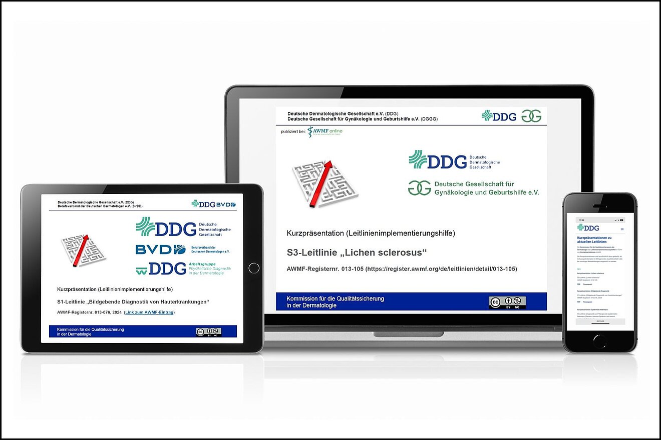Die Implementierungshilfen sind ausdrücklich dafür gedacht, von Kolleginnen und Kollegen als Schulungsmaterial in Mittagsvisiten, Qualitätszirkeln oder bei sonstigen Weiterbildungen eingesetzt zu werden. Die Kurzfassung steht im internen Bereich (bitte erst anmelden) auf derma.de als PDF und pptx zum Download bereit.