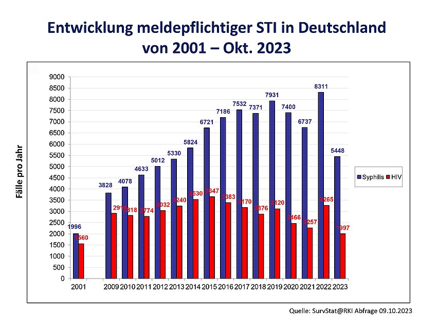 NB: Die SarsCoV-2-Pandemie hat weitestgehend zu einer Reduzierung von sexuellen Kontakten geführt, bis hin zur Monogamie und Abstinenz. Allerdings hat es eine große Gruppe von Menschen gegeben, die in privaten Zirkeln weiterhin vielfältige sexuelle Kontakte pflegten. In vielen Zentren, wie im WIR („Walk in Ruhr“ – Zentrum für Sexuelle Gesundheit und Medizin in Bochum), wurde eine deutlich höhere (bis zu 28%!) Infektionsrate registriert. Die Zahlen des Robert Koch-Instituts (RKI) belegen dies nicht. Dies könnte an den Schließungen von Testeinrichtungen im Öffentlichen Gesundheitsdienst und „Checkpoints“ (das sind auf sexuelle Gesundheit spezialisierte Beratungseinrichtungen, in denen das Testen im Vordergrund steht) in dieser Zeit gelegen haben.