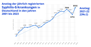 Im Gegensatz zu den anderen STI besteht für die Syphilis und die HIV-Infektion eine bundesweite Meldepflicht. Neuinfektionen werden nach dem Infektionsschutzgesetz nichtnamentlich an das Robert Koch-Institut (RKI) in Berlin gemeldet. Die dort ausgewerteten und jährlich im Epidemiologischen Bulletin veröffentlichten Daten zeigen (mit wenigen Ausnahmen) einen stetigen Anstieg der Neuerkrankungen in den letzten 20 Jahren. Nach einem durch die COVID-19 Pandemie bedingten kurzen Rückgang stiegen die Neuinfektionen 2022 um 23% auf 8.310 gemeldete Fälle. Betroffen sind vor allem Männer (94%). Die Syphilis connata (Übertragung von der schwangeren Mutter auf das Kind) ist aufgrund der obligaten Schwangerenvorsorge fast völlig verschwunden.