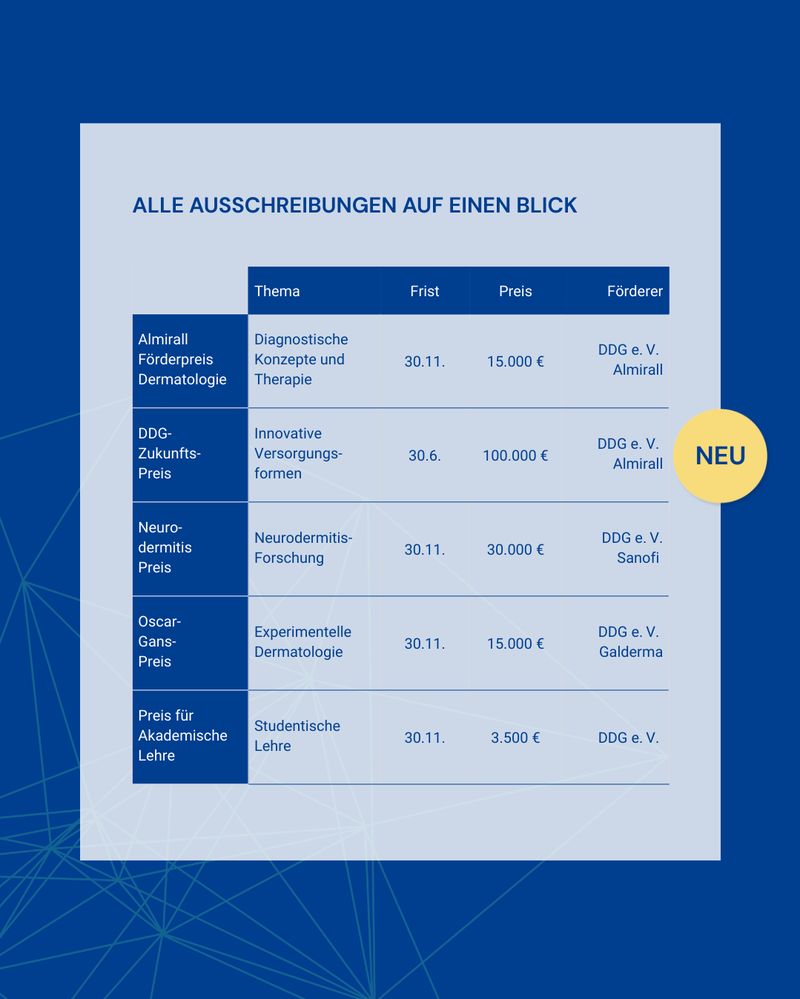 Neu hinzugekommen ist der DDG-Zukunftspreis für innovative Versorgungsformen in der Dermatologie. Mit ihm werden translationale Projekte ausgezeichnet, die die Versorgung von Menschen mit Hauterkrankungen innovativ, nachhaltig und nachweisbar verbessern. Der Preis ist mit bis zu 100.000 Euro dotiert.