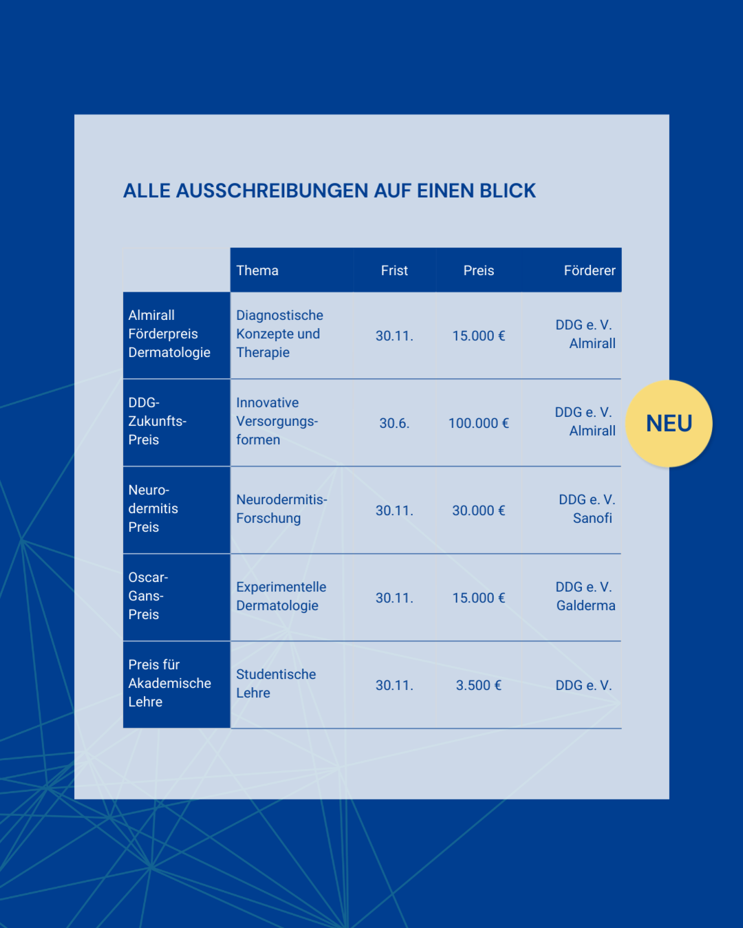 Zu den Auszeichnungen zählt der Deutsche Neurodermitis Preis, der sowohl klinische als auch präklinische Projekte im Bereich der Neurodermitis fördert. Mit dem Oscar-Gans-Preis ehrt die DDG exzellente wissenschaftliche Leistungen in der experimentellen Dermatologie. Der Almirall Förderpreis Dermatologie richtet sich an besonders hochwertige und innovative Arbeiten mit klinischer Relevanz an der Schnittstelle von Grundlagenforschung und klinisch-wissenschaftlicher Forschung. Der DDG-Preis für Akademische Lehre zeichnet engagierte Lehrende und innovative Lehrkonzepte aus, die die akademische Ausbildung in der Dermatologie nachhaltig bereichern.
