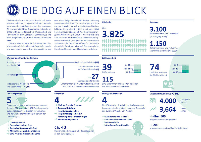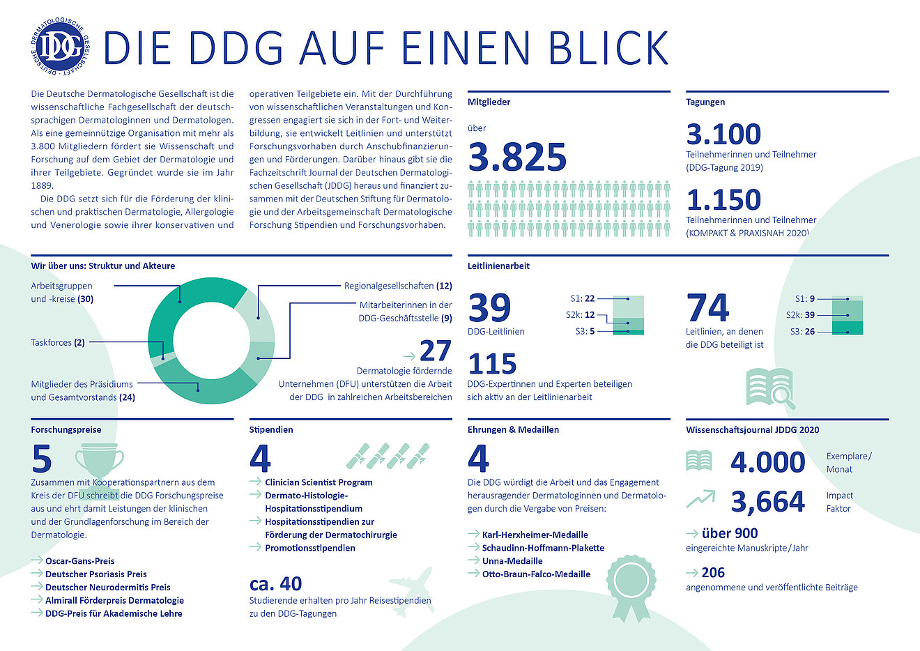 Wie viele Mitglieder hat die DDG? Welche Forschungspreise werden vergeben? Wie lässt sich die Leitlinienarbeit der DDG in Zahlen ausdrücken? Wie hoch ist der Impact Faktor des JDDG? Mit der Infografik „Die DDG auf einen Blick“ finden sich Antworten auf alle diese Fragen. Die Infografik gibt es im Hoch- und Querformat.