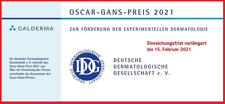 Der Oscar-Gans-Preis gehört zu den bedeutendsten Wissenschaftspreisen in der Dermatologie und wird alle zwei Jahre von der Deutschen Dermatologischen Gesellschaft e.V. (DDG) ausgeschrieben, um die experimentelle Dermatologie zu fördern. Teilnehmen können Dermatologinnen und Dermatologen sowie alle in dermatologischen Kliniken und Institutionen wissenschaftlich Tätigen. Eingereicht werden können wissenschaftliche Arbeiten aus der experimentellen Dermatologie, die seit/nach dem 1. Januar 2019 veröffentlich worden sind.