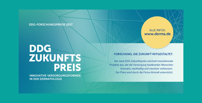 Mit dem neu ins Leben gerufenen „DDG-Zukunftspreis für innovative Versorgungsformen in der Dermatologie“ setzt die Deutsche Dermatologische Gesellschaft e. V. (DDG) das Thema Versorgung ins Zentrum eines Forschungspreises. Für den mit bis zu 100.000 Euro dotierten DDG-Zukunftspreis können translationale Projekte eingereicht werden, mit denen die Versorgung hautkranker Menschen innovativ, nachhaltig und messbar verbessert wird. Der Preis wird durch die Firma Almirall unterstützt. Bis zum 30.06.2026 können Anträge für das zweistufige Bewerbungsverfahren online eingereicht werden. Die Verleihung erfolgt auf der nächsten DDG-Tagung (21. bis 24.04.2027) in Berlin.