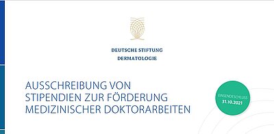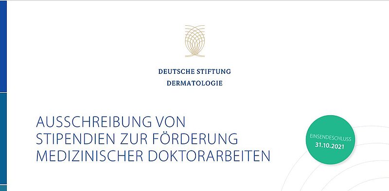 Die Deutsche Stiftung Dermatologie schreibt fünf Promotionsstipendien an deutschen Hautkliniken aus. Die Stellen sind mit 600 Euro pro Monat dotiert und werden über zwölf Monate vergeben. Bewerbungsschluss ist der 31. Oktober 2021.
