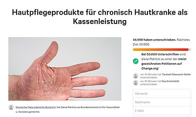 Der Deutsche Neurodermitis Bund e. V. versucht, diesen diskriminierenden Zustand und die enorme wirtschaftliche Benachteiligung der chronisch Hautkranken zur Sprache zu bringen und zu bewirken, dass die Kosten für die notwendigen Pflegeprodukte von den Krankenkassen mitgetragen werden.