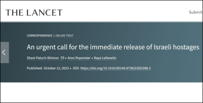 Paluch-Shimon S, Popovtzer A, Leibowitz R: An urgent call for the immediate release of Israeli hostages. October 12, 2023 DOI:https://doi.org/10.1016/S0140-6736(23)02288-2 https://www.thelancet.com/journals/lancet/article/PIIS0140-6736(23)02288-2/fulltext