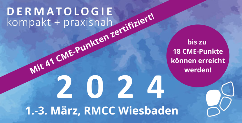 Das wissenschaftliche Programm der DERMATOLOGIE kompakt & praxisnah (1.-3. März 2024 in Wiesbaden) ist jetzt von der Landesärztekammer Hessen mit insgesamt 41 Punkten zertifiziert. Die Kurse am Freitagvormittag sind extra zertifiziert. Wer die gesamte Tagung besucht und dazu vielleicht noch einen Kurs bucht, kann also bis zu 18 CME-Punkte erwerben.