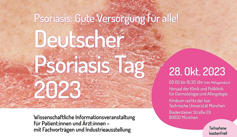 Anlässlich des Welt-Psoriasis-Tages 2023 laden der Deutsche Psoriasis Bund (DPB) und die Klinik und Poliklinik für Dermatologie und Allergologie am Klinikum rechts der Isar, in Kooperation mit dem Berufsverband der Deutschen Dermatologen (BVDD), der Deutschen Dermatologischen Gesellschaft (DDG) und den Regionalen Psoriasisnetzen in Deutschland (PsoNet) sehr herzlich zur Teilnahme an einer Informationsveranstaltung in München ein. Sowohl die Präsenzveranstaltung als auch die Teilnahme per Livestream ist kostenfrei.