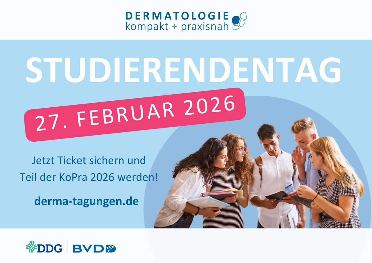 Die DERMATOLOGIE kompakt + praxisnah (KoPra) vom 26.-28. Februar 2026 kostenfrei besuchen, einen Reisekostenzuschuss erhalten und in die Welt der Dermatologie eintauchen – das gelingt mit dem Reisestipendium für Studierende der Humanmedizin.